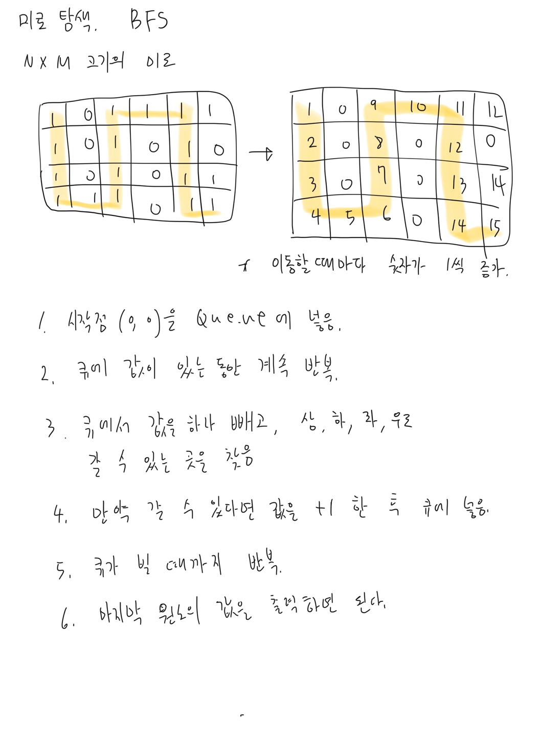 미로에서 1은 이동할 수 있는 칸을 나타내고, 0은 이동할 수 없는 칸을 나타낸다. 이러한 미로가 주어졌을 때, (1, 1)에서 출발하여 (N, M)의 위치로 이동할 때 지나야 하는 최소의 칸 수를 구하는 프로그램을 작성하시오. 한 칸에서 다른 칸으로 이동할 때, 서로 인접한 칸으로만 이동할 수 있다.