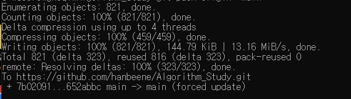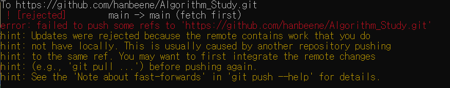 * 만약 git push를 했을 때 아래와 같은 오류가 난다면 git push origin +main 명령어를 이용하여 push 하도록 한다.