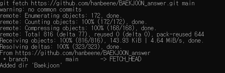 * 난 Algorithm_Study 리포지토리 안에 Baekjoon이라는 폴더를 만들었는데, 이곳에 기존에 있던 BAEKJOON_answer라는 리포지토리를 넣는 것이다.